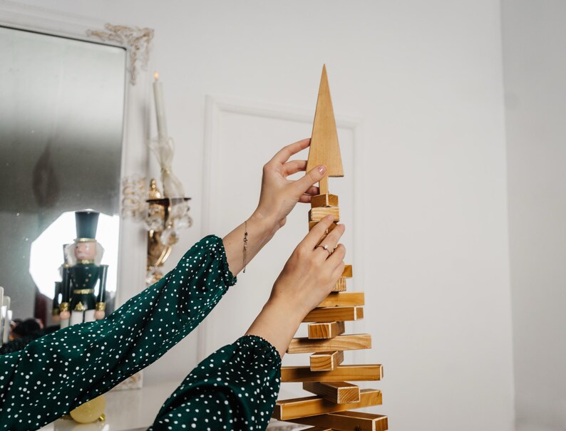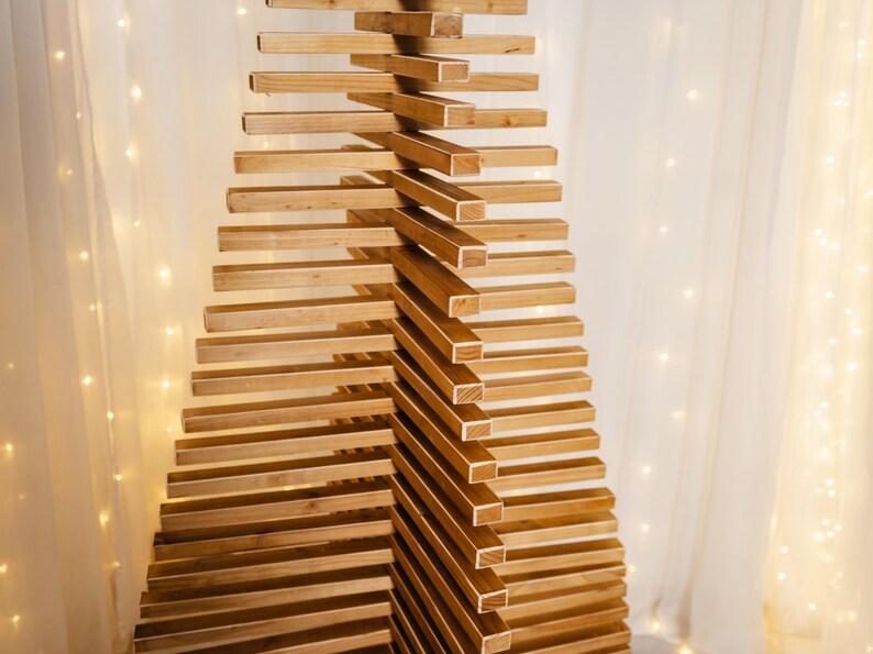 This wooden unusual Christmas tree is a modern, handmade alternative to the traditional fir. It reflects Scandinavian aesthetics through clean lines and natural wood texture. The pallet-style construction gives it a distinctive, rustic character, making it both a holiday decoration and a meaningful New Year symbol.