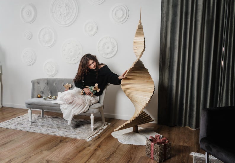 This unusual wooden Christmas tree is designed as a holiday accent for cozy seasonal decor. Crafted in a Scandinavian style, this pallet tree serves as a unique and sustainable alternative to a traditional Christmas tree.