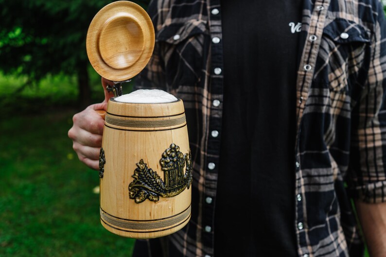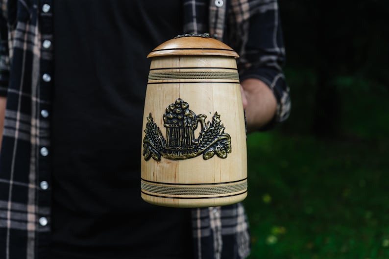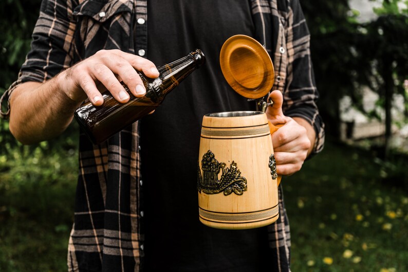 With its medieval-inspired design, the stein adds character to any man cave, home bar, or kitchen display. It is ideal as a thoughtful 5th anniversary gift (traditional wood anniversary), a unique dad present, or a standout beer accessory for him. This wooden stein blends functionality with timeless style