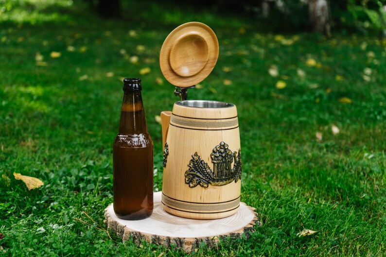 This men’s beer mug combines rustic charm with practical design. It’s crafted from high-quality wood and features a stainless steel flask liner for a durable and authentic feel. Its large 16.9 oz (500 ml) capacity is perfect for enjoying ales, lagers, or your favorite craft beers.