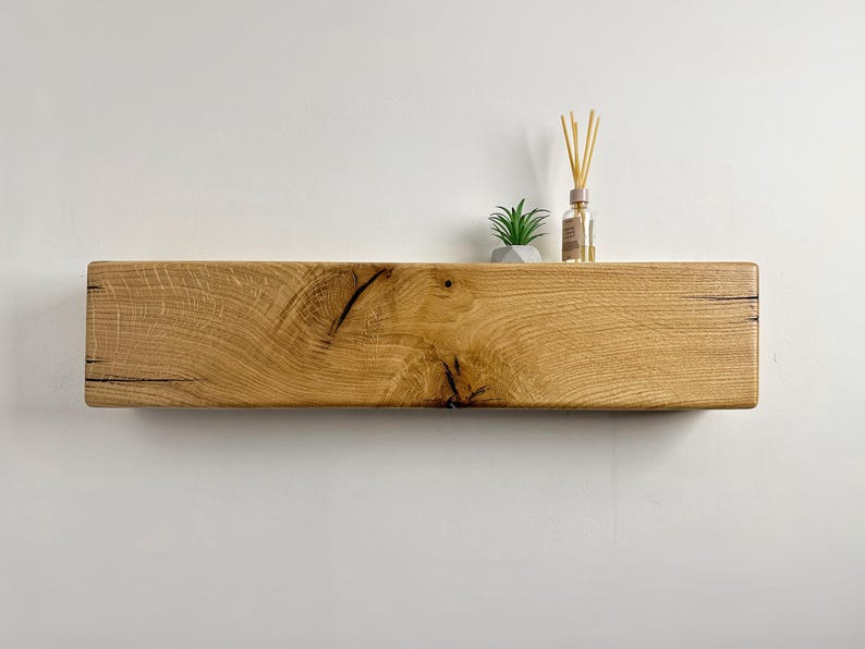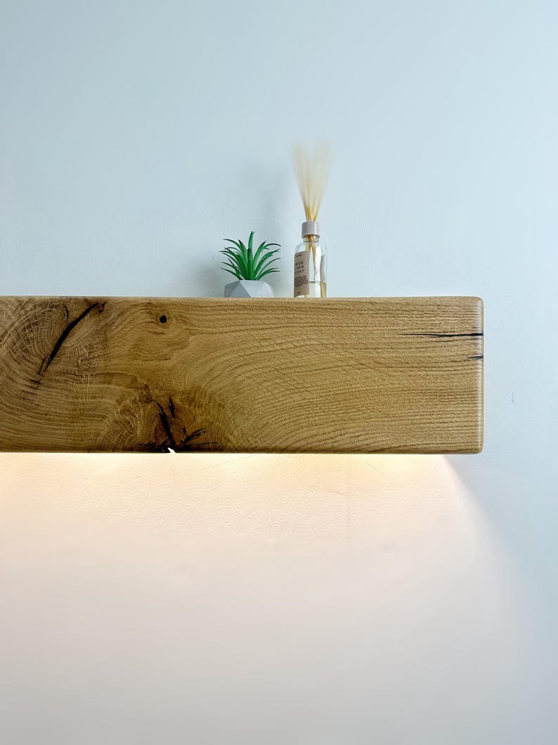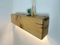 Handcrafted from authentic reclaimed oak wood, this stylish wall-mounted shelf doubles as a discreet light fixture. Its minimalist, horizontal design with hidden lighting creates a warm, atmospheric glow, ideal for bedrooms, hallways, or living areas. The natural imperfections of the aged oak add a unique rustic-modern character to your space.