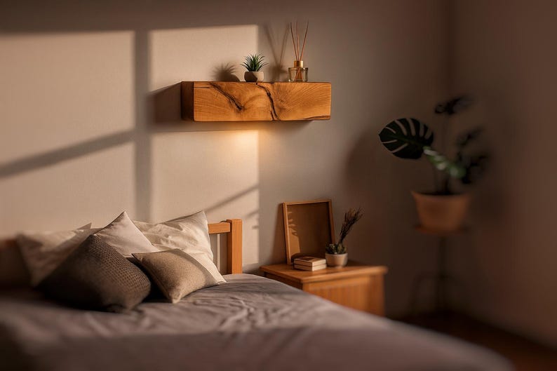 Wooden Wall Lighting: Horizontal Wall Sconce & Floating Shelf